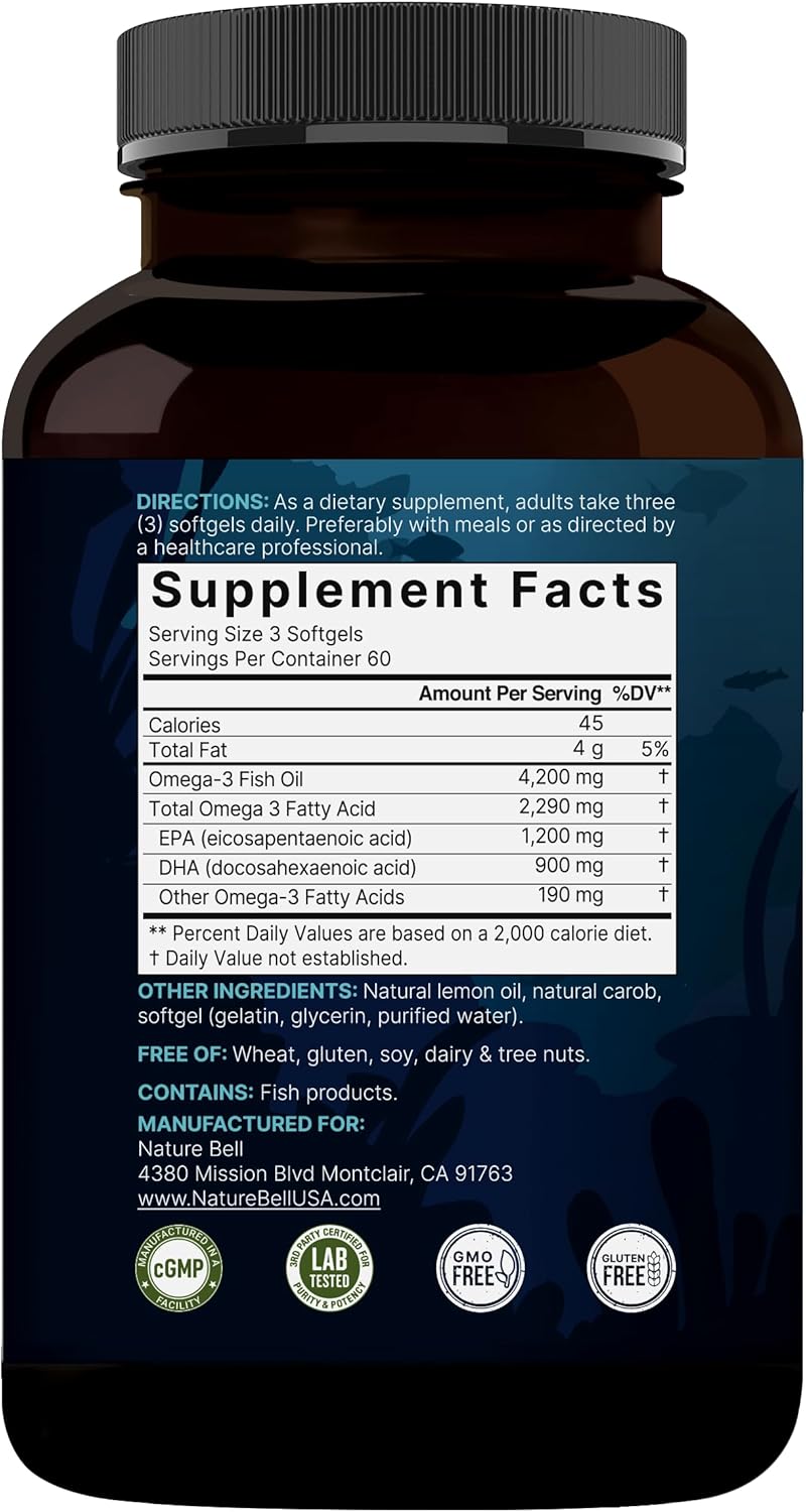 Naturebell Omega-3 Fish Oil provides a potent 4,200 mg of fish oil per serving, offering an optimal dose of EPA and DHA to support heart, brain, and joint health. With a refreshing burpless lemon flavor, these softgels are easy on the stomach and promote optimal absorption without the unpleasant fishy aftertaste. This high-quality fish oil is perfect for anyone looking to maintain overall well-being and enhance cognitive and cardiovascular function.
