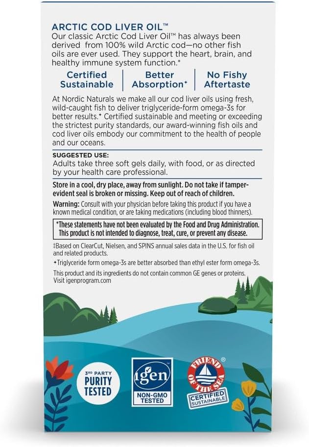 💧 Nordic Naturals Arctic Cod Liver Oil is sourced exclusively from 100% wild Arctic cod caught in the clean, cold waters of Norway. Naturally rich in Omega-3s (EPA & DHA) and vitamin A and D, this premium fish oil supports your heart, brain, vision, joints, and immune system — all with a refreshing lemon flavor and no fishy aftertaste.